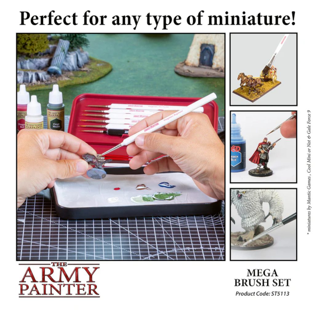 The Army Painter ST5113 Mega Brush Set includes 10 handcrafted brushes, featuring natural fiber bristles, ideal for miniature painting, detailing, and advanced techniques.