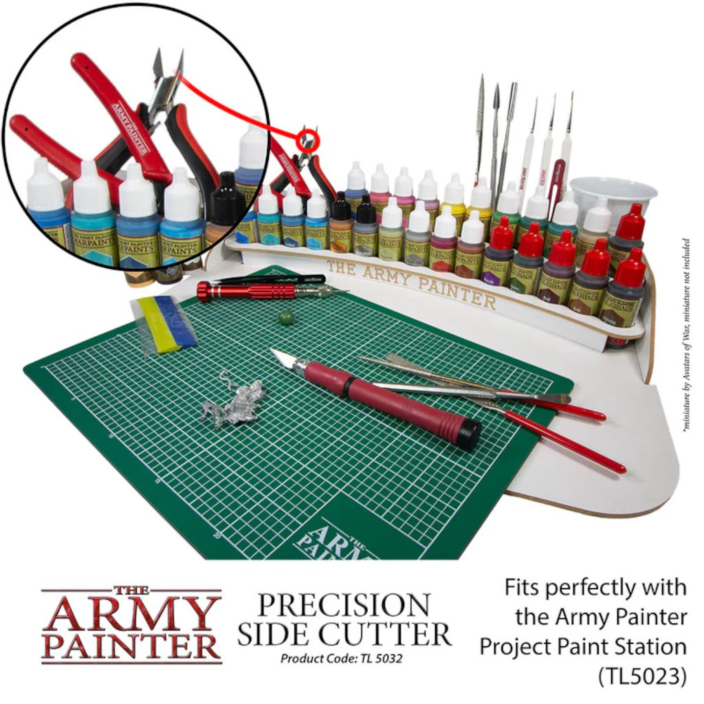 The Army Painter TL5032 Precision Side Cutter features durable stainless steel blades and ergonomic handles, ideal for clean, precise cuts on plastic, resin, and metal miniatures.
