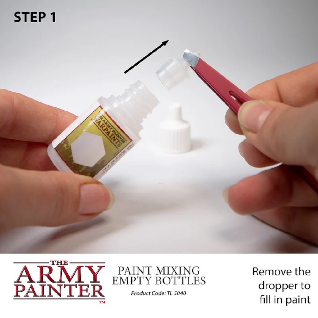 The Army Painter TL5040 Paint Mixing Empty Bottles include six 12ml containers with see-through labels, perfect for customizing and storing unique paint mixtures.