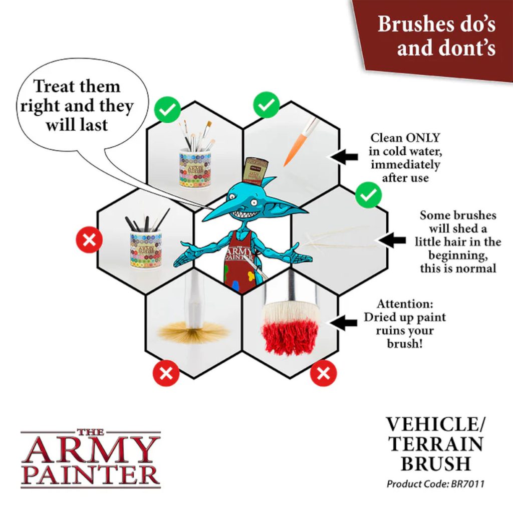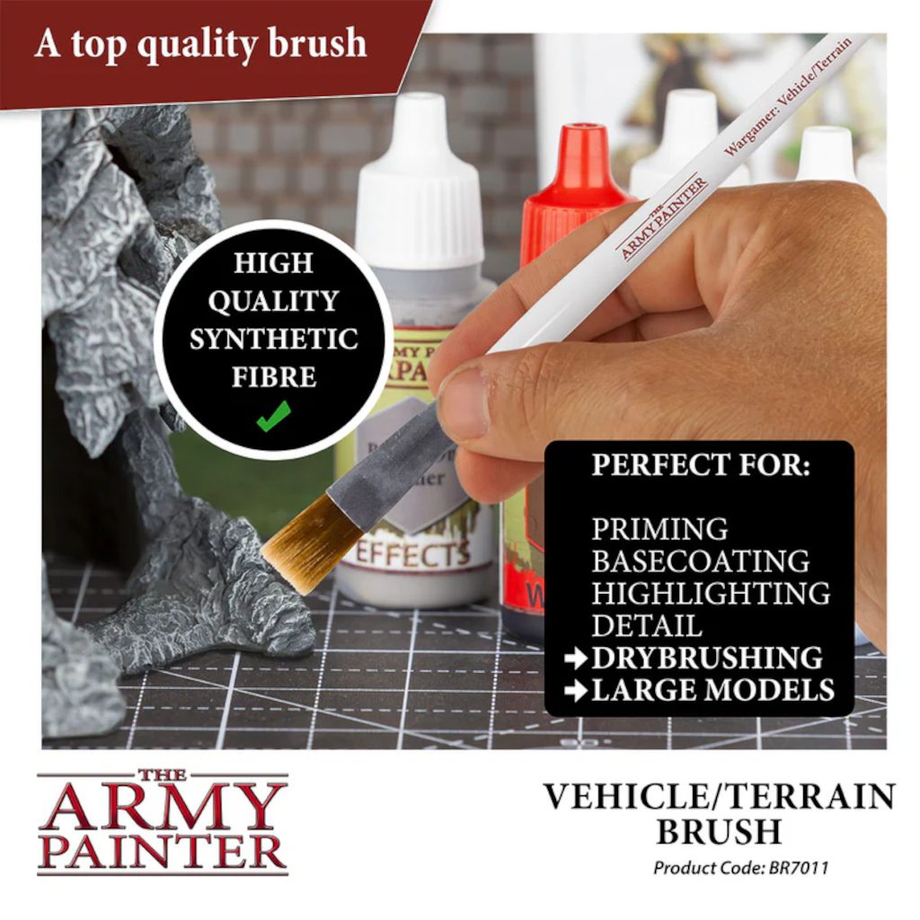 The Army Painter Wargamer Brush BR7011 Vehicle & Scenery features a flat, stiff end, perfect for drybrushing large models, terrain, and highlighting vehicle edges.