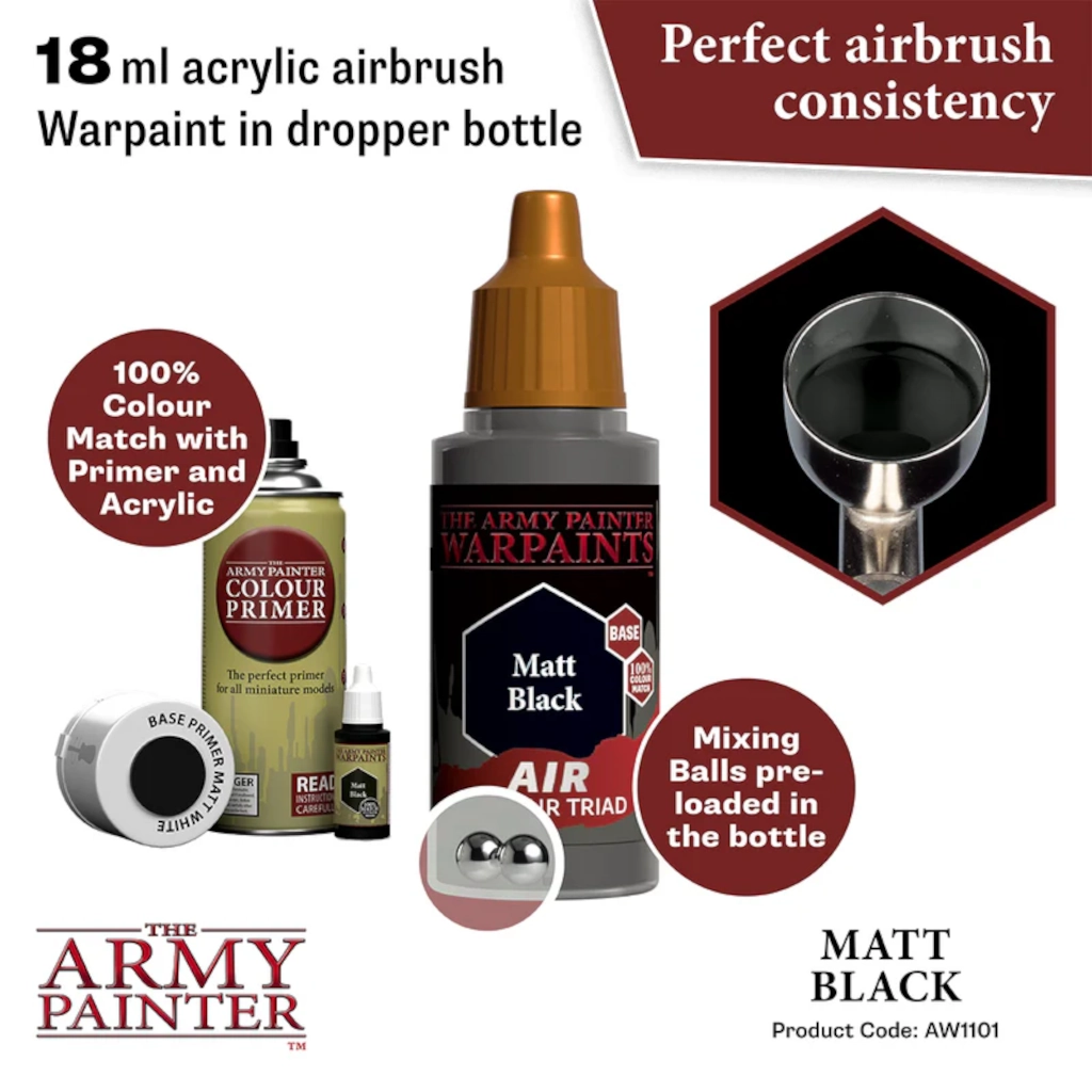 The Army Painter Warpaints Air AW1101 Matt Black 18ml is one of 126 primary colours from the Army Painter Warpaints Air range & is also part of the Raven Black Warpaints Air Triad.