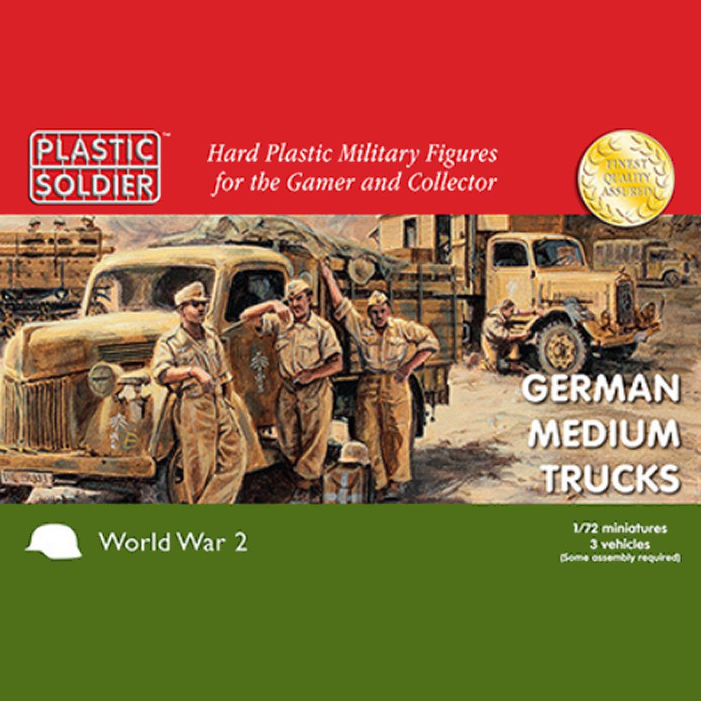 The Plastic Soldier Company Easy Assembly plastic injection moulded WW2V20020 1/72nd German Opel Blitz Medium Trucks. Each sprue contains options to build an L3000 Mercedes cab option, a Maultier option, 2 cargo beds and a canvas tilt. The cab has open windows, 2 driver figures and cab detail