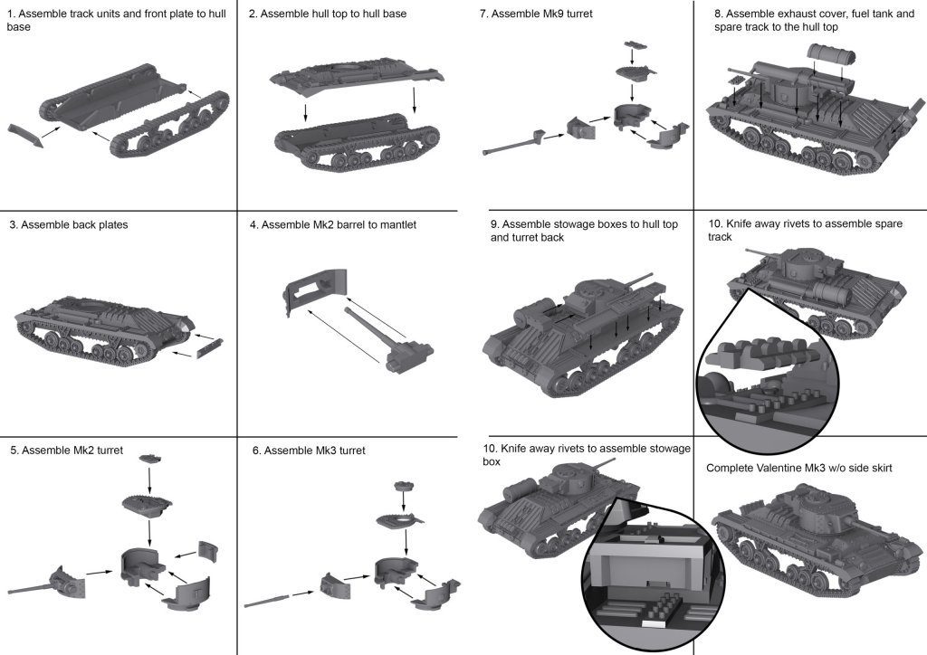 The Plastic Soldier Company Easy Assembly plastic injection moulded WW2V20028 1/72nd British Valentine Tank. Three models in the box. Contains options to build Mk II, III or Mk IX versions and has British and Soviet commander figures.
